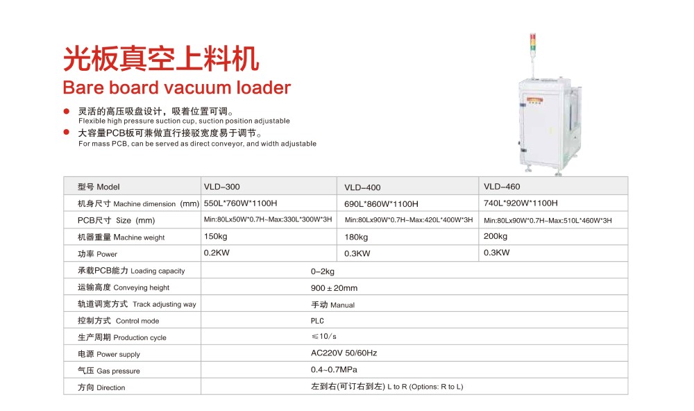 | PCB尺寸(mm) | Min:80Lx50W*0.7H~Max:330L*300W*3H | Min:80Lx90W*0.7H~Max:420L*400W*3H | Min:80Lx90W*0.7H~Max:510L*460W*3H |