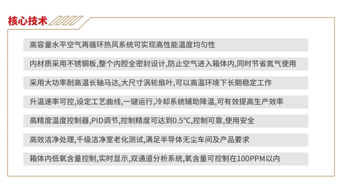 日東科技SEO系列半導體充氮烤箱通用性強,通過充入氮氣將烤箱中的氧氣排出,防止烘烤高溫產生氧化現(xiàn)象。設備采用高容量水平空氣再循環(huán)系統(tǒng),采用專有的腔室結構和密封技術,具有出色的氣密性和溫度均勻性,滿足半導體產品高性能要求,適用于固化半導體晶圓、IC封裝(銅基板,銀膠,硅膠,環(huán)氧樹脂)、玻璃基板等產品烘烤。